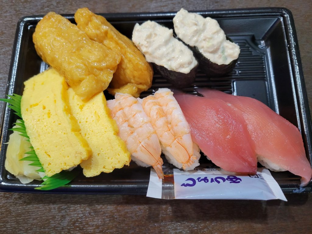 マグロ、エビ、たまご、いなり、ツナマヨが各2貫ずつです。