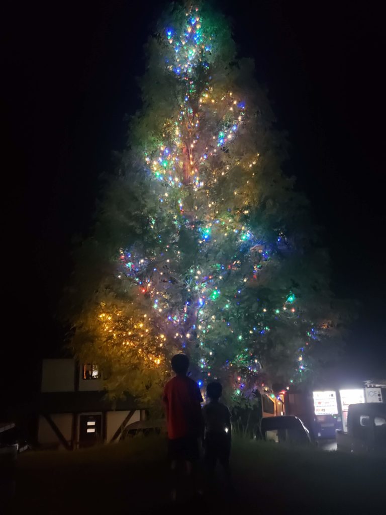 季節違いのイルミネーションツリーを見ながら花火を楽しみました。