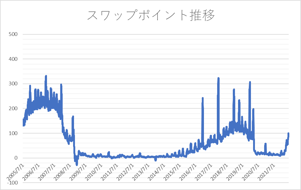コロナ前の2018年の水準は、スワップポイントは100円付近で推移していました。