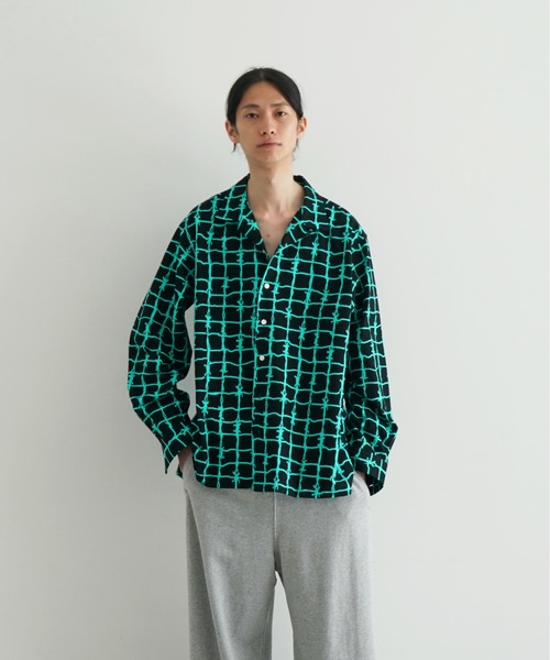 男女兼用で着用できる長袖シャツ。グリーンをベースに、有刺鉄線をモチーフにしたシュールなデザインが印象的で、スタイリングに程よいエッジをプラスします。デニムやチノパンなどカジュアルなパンツと相性が良く、シンプルに合わせるだけで存在感のあるコーディネートが完成する一枚です。
