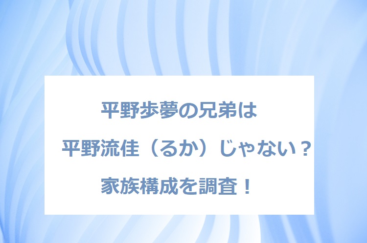 平野歩夢の兄弟は平野流佳(るか)じゃない?家族構成を調査!スノーボード男子ハーフパイプで活躍中の平野歩夢さん。 金メダルを獲得し、ますます活躍が期待されますね! スノーボードの選手には「平野」という苗字の人が多いですね! 2022年北京オリンピックでも話題の平野歩夢さんですが、 平野流佳(ひらのるか)さんとは兄弟なのか、家族構成を調査しました。 平野歩夢の兄弟は平野流佳(るか)じゃない?家族構成を調査!|オトナ女子スタイルアップブログスノーボード男子ハーフパイプで活躍中の平野歩夢さん。 金メダルを獲得し、ますます活躍が期待されますね! 2022年北京オリンピックでも話題の平野歩夢さんですが、平野流佳(ひらのるか)さんとは兄弟なのか、家族構成を調査しました。otonajyoshitrend.com