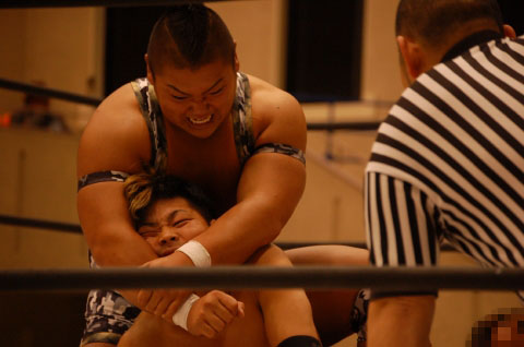 Eitaの健闘むなしく、ビッグRの砲丸投げスラムで大ダメージをくらい、あえなく敗北。