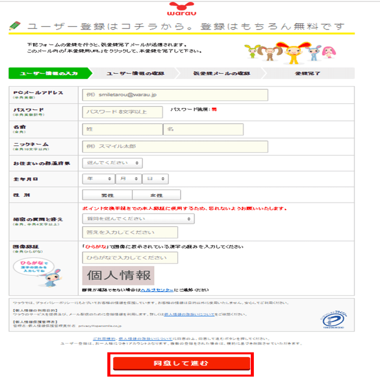 ③情報入力画面で必要事項を入力し「同意して進む」をクリック