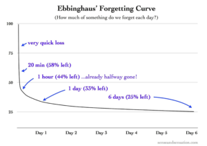 これはドイツの心理学者のヘルマン・エビングハウスさんが導き出した理論で、時間の経過とともに人の記憶がどのように変化していくかを示したものである。