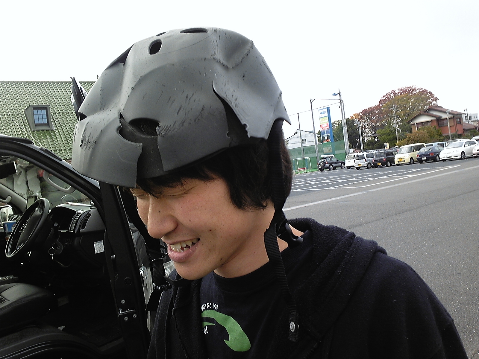 愛用の羽島用ヘルメットが、見るも無残な形になっていたわけで。。。とーさん。。。