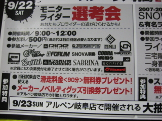 スノーヴァ羽島で各メーカーモニターライダー+SNOVAライダー選考選考会&試乗会を行ないます。
