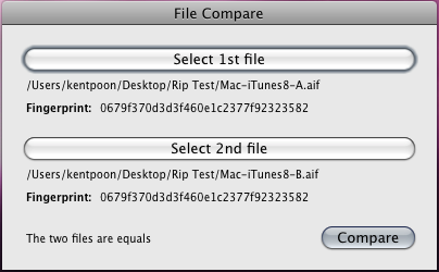 But are these files identical to the CD source? We will find out later. But first, I tested 10 times, drag(rip) the same file from the same disc. Compares all these 10 files with a Mac application "File Compare 1.1".