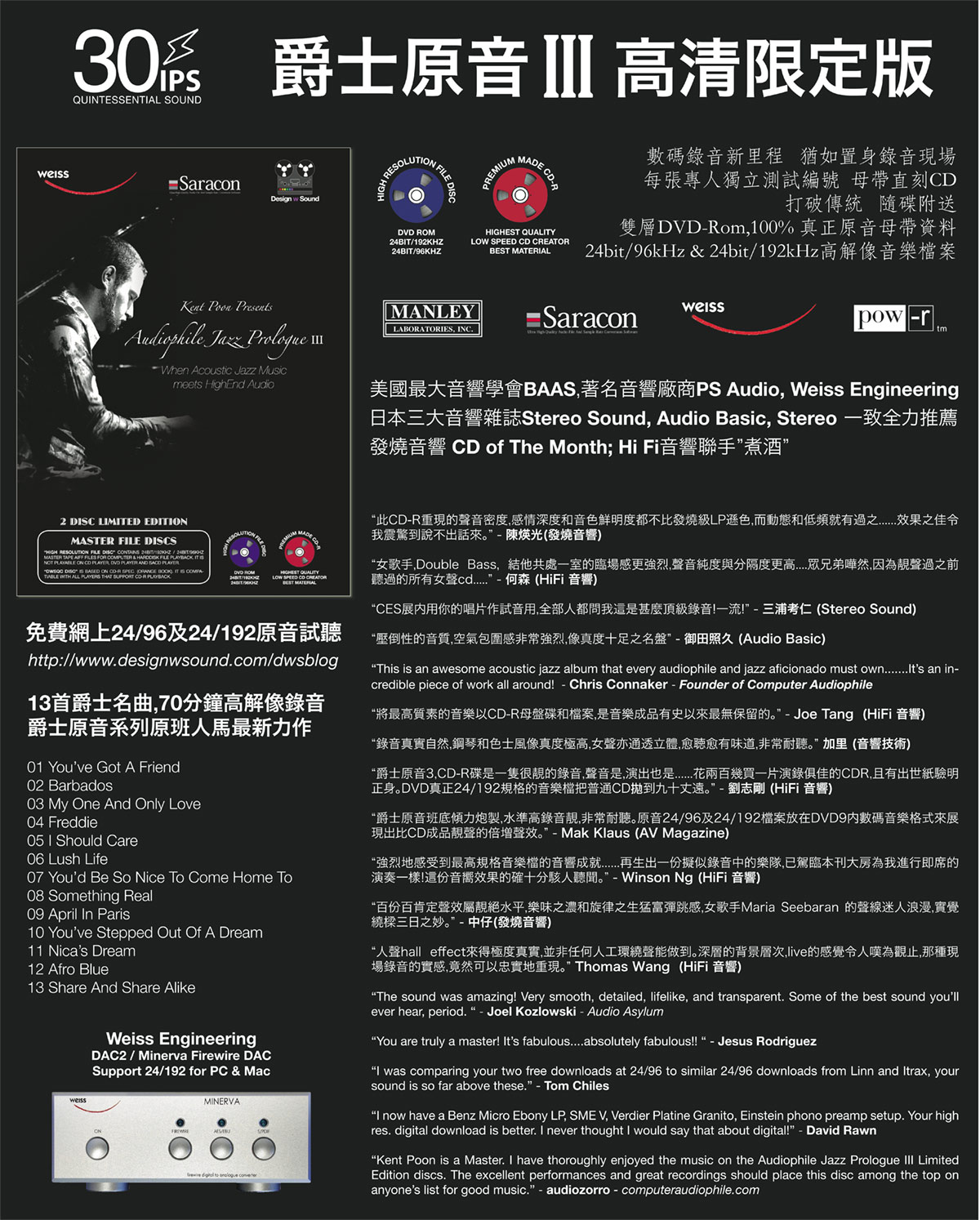 “爵士原音3,CD-R碟是一隻很靚的錄音,聲音是,演出也是......花兩百幾買一片演錄俱佳的CDR,且有出世紙驗明正身。DVD真正24/192規格的音樂檔把普通CD)_到九十丈遠。” - 劉志剛 (HiFi 音響)