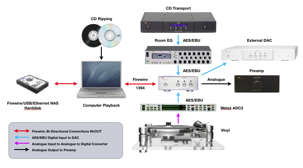 DAC2/Minerva can record AES input signal to computer. Combine the Weiss reference ADC2, audiophile can record their vinyl collection with up to 24bit/192kHz resolution on computer hard disk for further playback in full resolution.