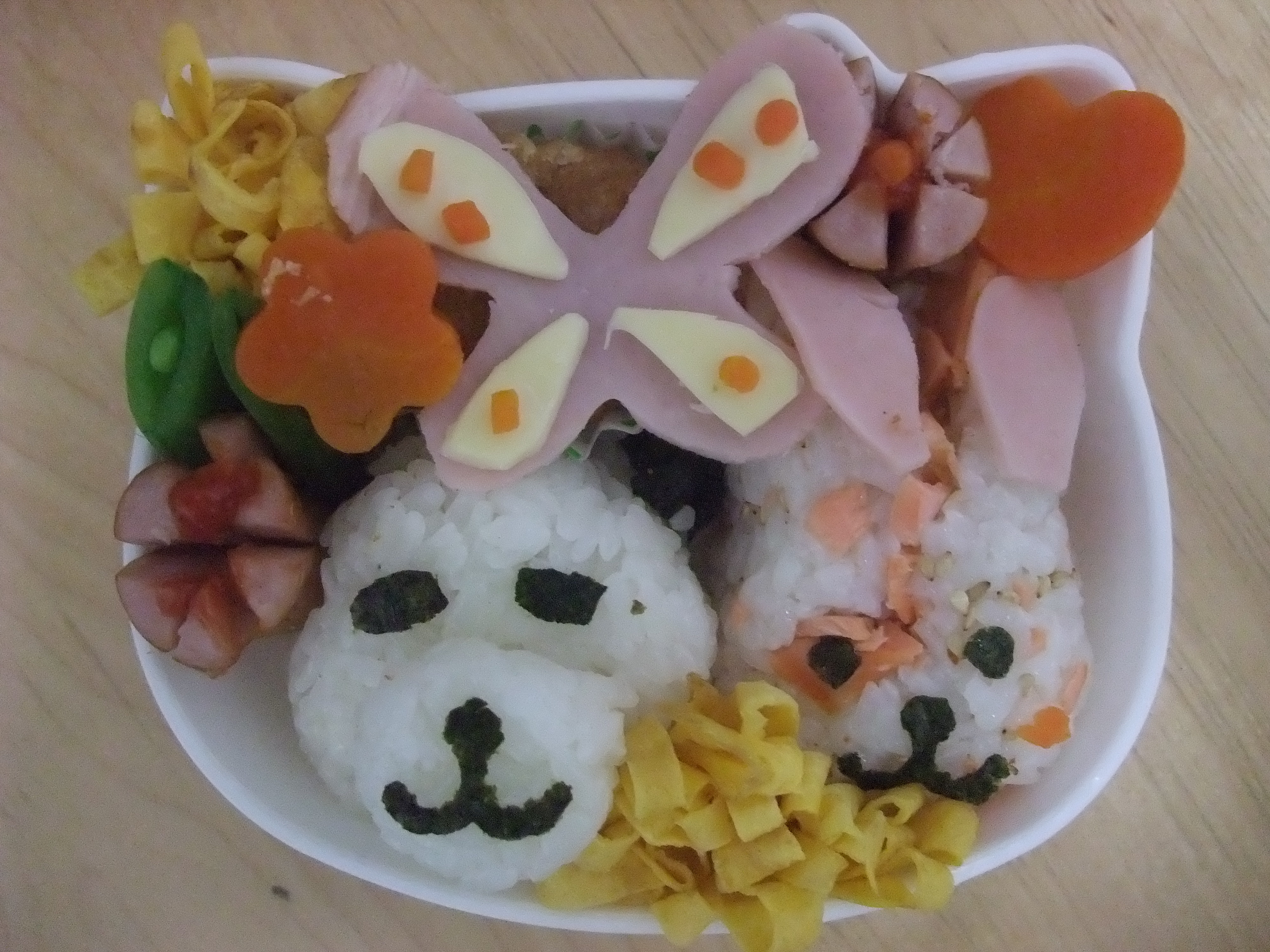 お弁当ですが、パンダ・ウサギのおにぎりがデカすぎて、ゴチャゴチャしたものになってしまいました![]()