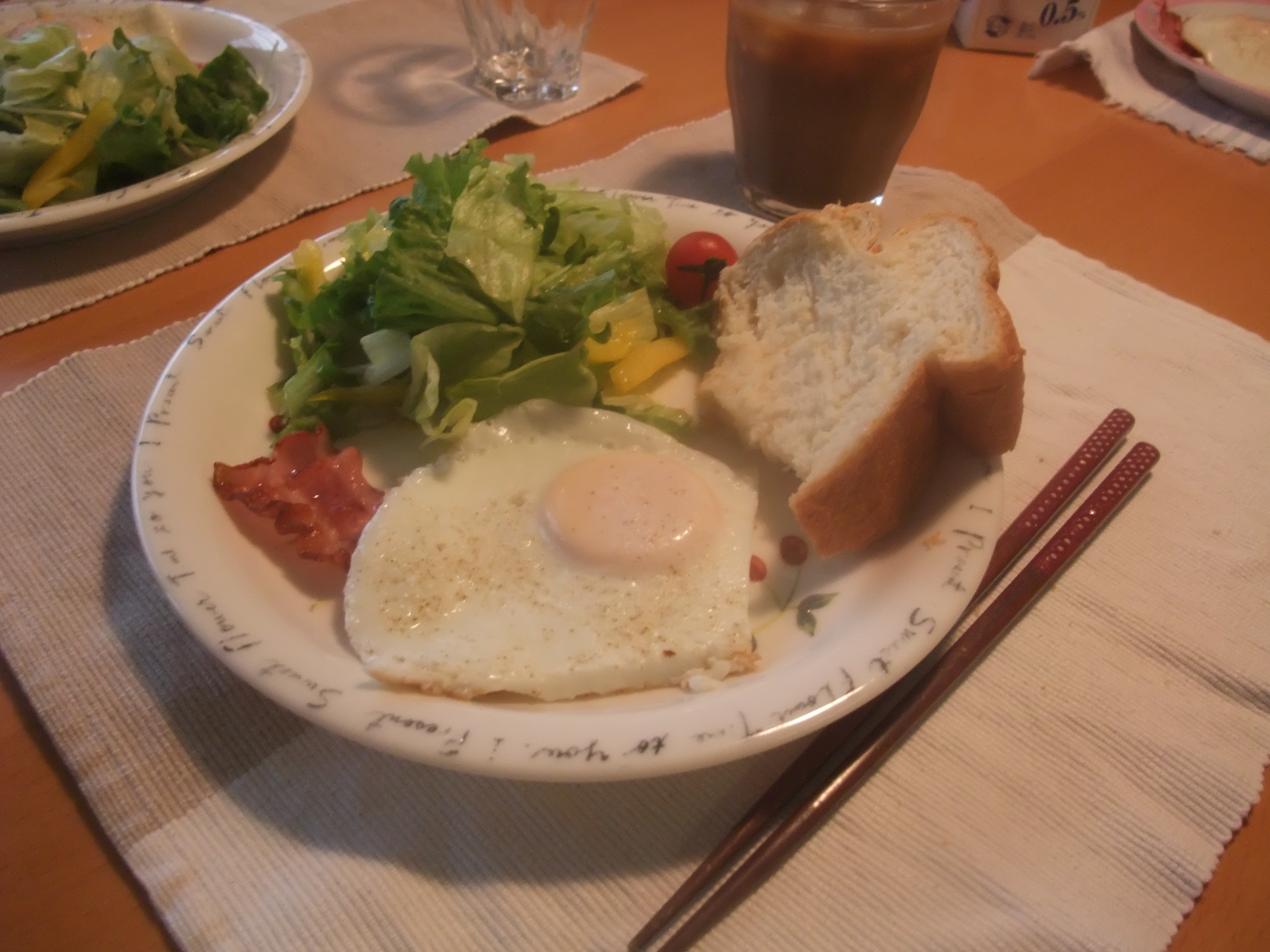 上新粉を使ったパンを作ってみました~♪ 今日の朝食のパンは上新粉を使ったパンにしてみました(・∀・) いつもよりモチモチで相変わらずフワッフワッでした やっぱり焼きたてはいいですね 朝食メニュー 厚切りパン サラダ ベーコンエッグ コーヒー このベーコンエッグをめぐって事件が 娘が全く食べてないのでメタボ夫がベーコンを一口食べたとたん大泣き そして目玉焼きも一口食べられちゃったからさらに泣いて大変でした あんなに泣くほど食べたかったはずなのに、結局は黄身だけしか食べなかったんですけどね・・・ 朝から疲れました・・・・