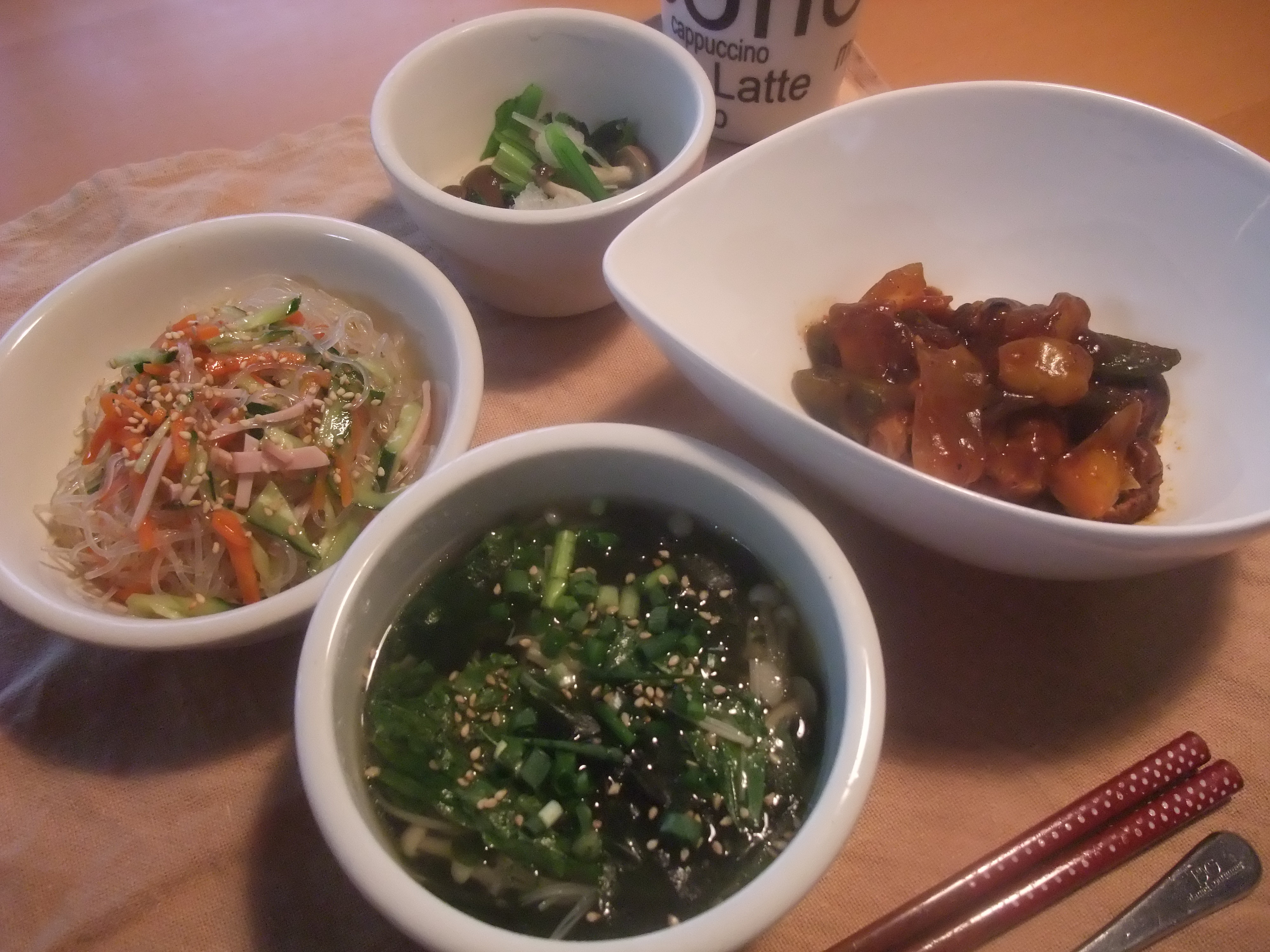 晩ごはんはヘルシー中華にしてみました 今日の晩ごはんは中華( ̄∇ ̄) メタボ家族なのでヘルシーにするため頑張りました 今日使ったお肉は豚挽き肉100gぐらいでしょうか・・・・ 油もゴマ油を少々のみ 肉団子のなかには豆腐と野菜の皮までいれちゃいました 晩ご飯メニュー 豆腐入り肉団子の酢豚 わかめ・レタス・えのきのスープ 春雨サラダ しめじ・小松菜のみぞれ和え メタボ夫から電話が・・・・ 「今日は晩ご飯いりません」(゚∇゚ ;)エッ!? 「もう作ってますが・・・」(´-д-;`) 毎朝、確認してるんですがたまにこういうことありますね・・・。 なので、メタボ夫の春雨サラダとスープ(汁のみ)は娘が食べちゃいました