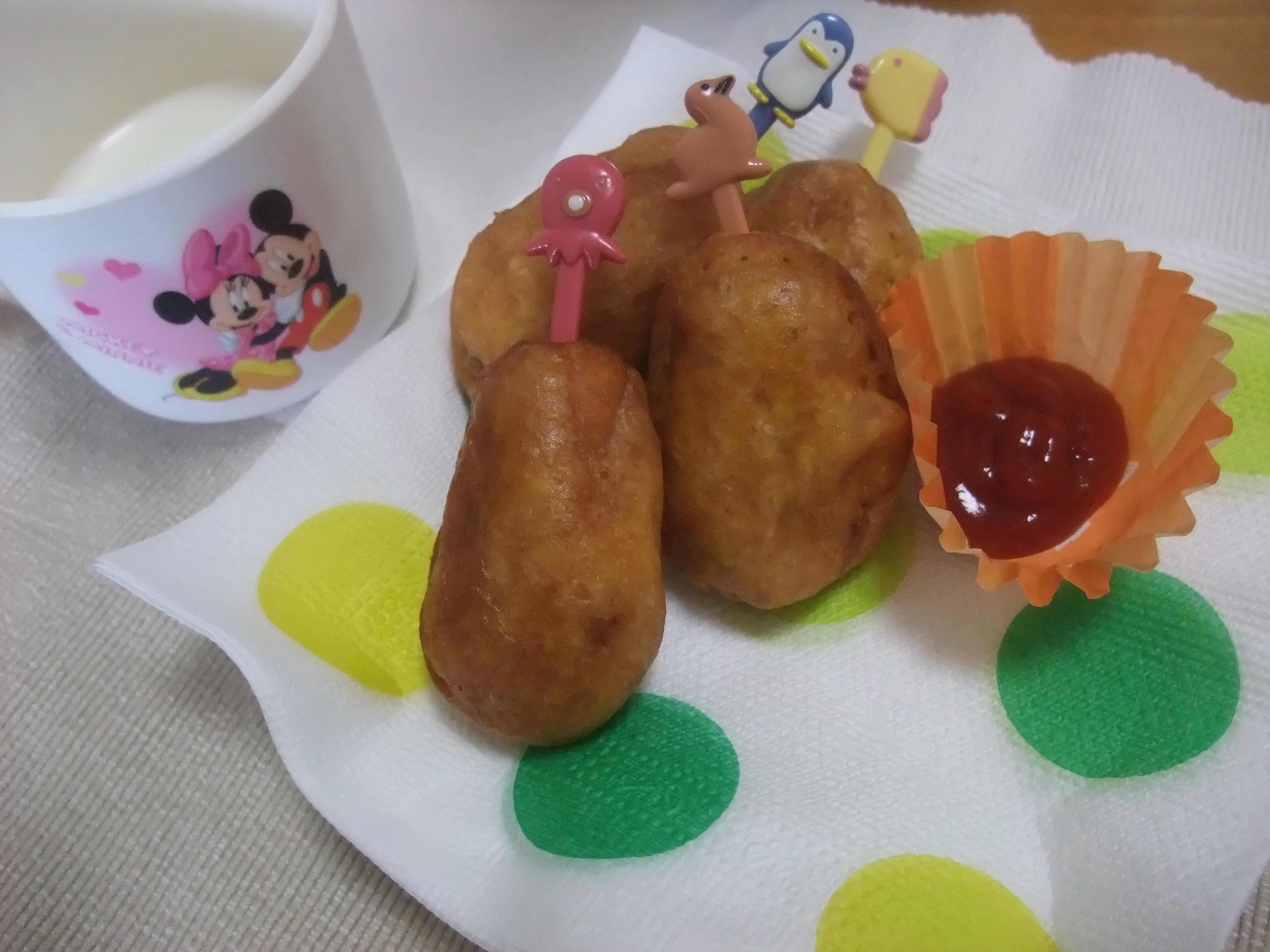 ホットケーキミックスでアメリカンドッグ 娘から「何か作ろうよ~」とせがまれ作ってみました(・∀・) ホットケーキミックスをウインナーに絡ませて揚げるだけなんで簡単 もちろん娘にもお手伝いしてもらいました 市販品みたいに衣がしっかりしてないけどおいしかったです メタボ夫は朝まで飲んで二日酔い中 娘が幼稚園お休みの日は遊んであげてくださいね・・・。