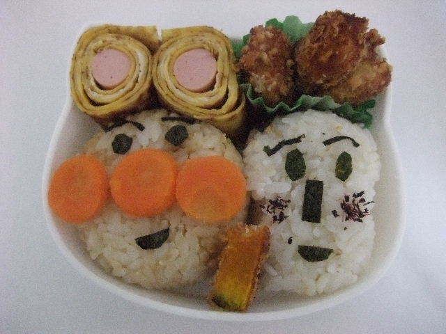 初!キャラ弁当 明後日から子供のお弁当が始まるので、どのくらい食べれるのか作ってみました。 うちの子は野菜が全くダメなので、とりあえずアンパンマンとショクパンマンのおにぎりを作っていれてみると隙間はわずか・・・。 卵とカツを入れれば完成 これなら喜んでくれるかもと子供に渡すと ママー ありがとう アンパンマンとホラーマンだぁ(*゚▽゚*) それ、ショクパンマンなんですけど・・・ でもわずかにいれてみた野菜以外は全部食べてくれたのでよかったです