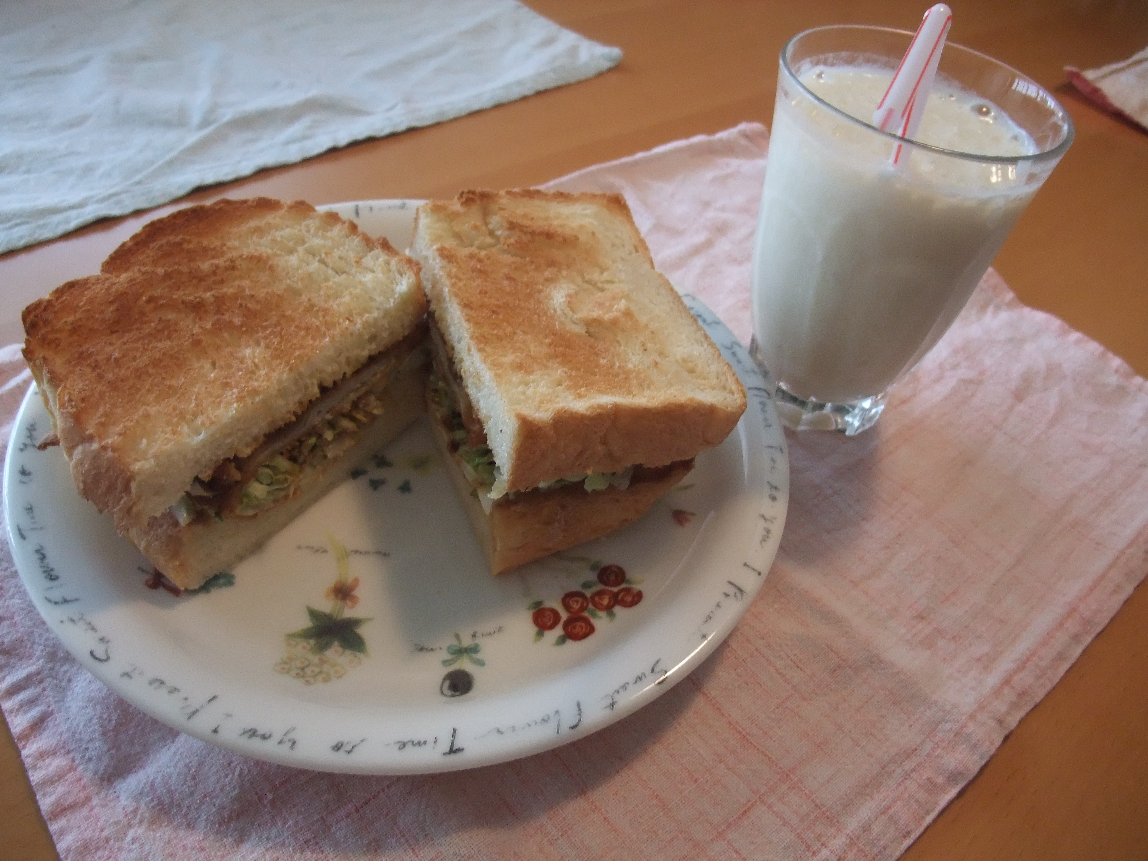 朝食はカツサンド&バナナジュース 朝から高カロリーメニューです 今日のパンは パン・ド・ミ です これはとてもシンプルなので材料費も安いですがおいしいですよ カツのパン粉もモチロン自家製です バナナは熟しすぎたのでジュースにしちゃいました メタボメニューだけど朝だからいいよね・・・・