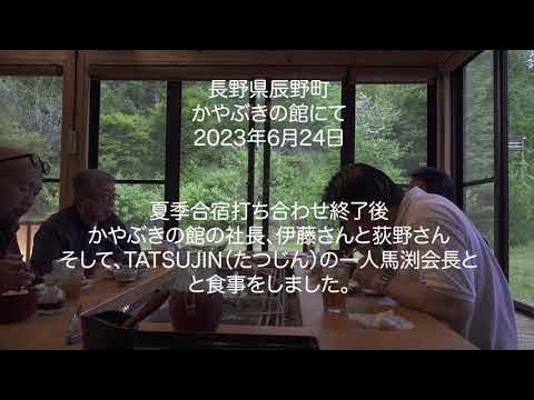 6月24日の土曜日、私は長野県辰野町~かやぶきの館にて夏季合宿の打ち合わせをしていました。打ち合わせ終了後、かやぶきの館の社長、伊藤さんと荻野さん、そして、TATSUJIN(たつじん)の一人馬渕会長と食事をしました。初めは取り留めもないことを話していたのですが、絶妙のタイミングで素敵な音楽が聞こえてきました。