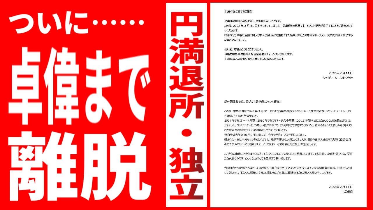 円満?ホントウかぇ。 中島卓偉、アップフロントグループのJ.PROOMとの専属契約を終了し新たな歩みへ - エンタメアライブハロプロのアイドルグループのファンにとっても無視しえぬアーティスト、ロックシンガーにして才能あふれる作詞・作曲・編曲家である中島卓偉が、所属していたアップフロントグループのジェイピィールームとの専属契約を終了する。ジェイピィールーム株式会社www.entamealive.com ↓こっち。かとたかさんのが するどいと思う。 ようこそ!ハロプロ研修生新メンバー&ありがとう!ハロドリ実況してくれるハロヲタ旧メンバーたち心置きなくハロドリ実況してくれていいんだよ、福田真琳ちゃん。youtu.be