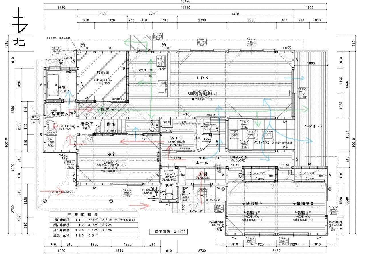 まず赤線のように、『ただいま~』と入った玄関ホール脇にWICを設けました。