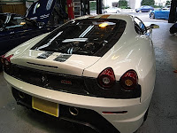 後姿も美しいです。白を選ばれたところがセンスいいですねー、ラインはステッカーではなくペイントですわー。こちらのお客様はいつも迷わずMAXで一番いいコーティング(アルティメイト プロ)をしてくれと言ってくれます。Sさんのお車今まで何十台も施工してきました。コーンズさんから直接入庫してMAXの目で見てくれ、『おまえがOKならOKだ』、と言ってくれるぐらい信頼してくれてます。そんな方々に支えられてなんとかやってます。今のスクーデリアはすごく希少らしいです。会社に寝泊りしようかなー・・・・心配なので・・・・・・^^