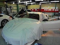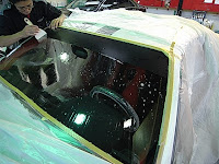 お客様から、サーキットを走るのでフロントガラスにハチマキを貼ってほしいと言われました。MAXの裏メニューです。いつも、なじみのお客様には出てくるガラスコーティング以外のメニューです。