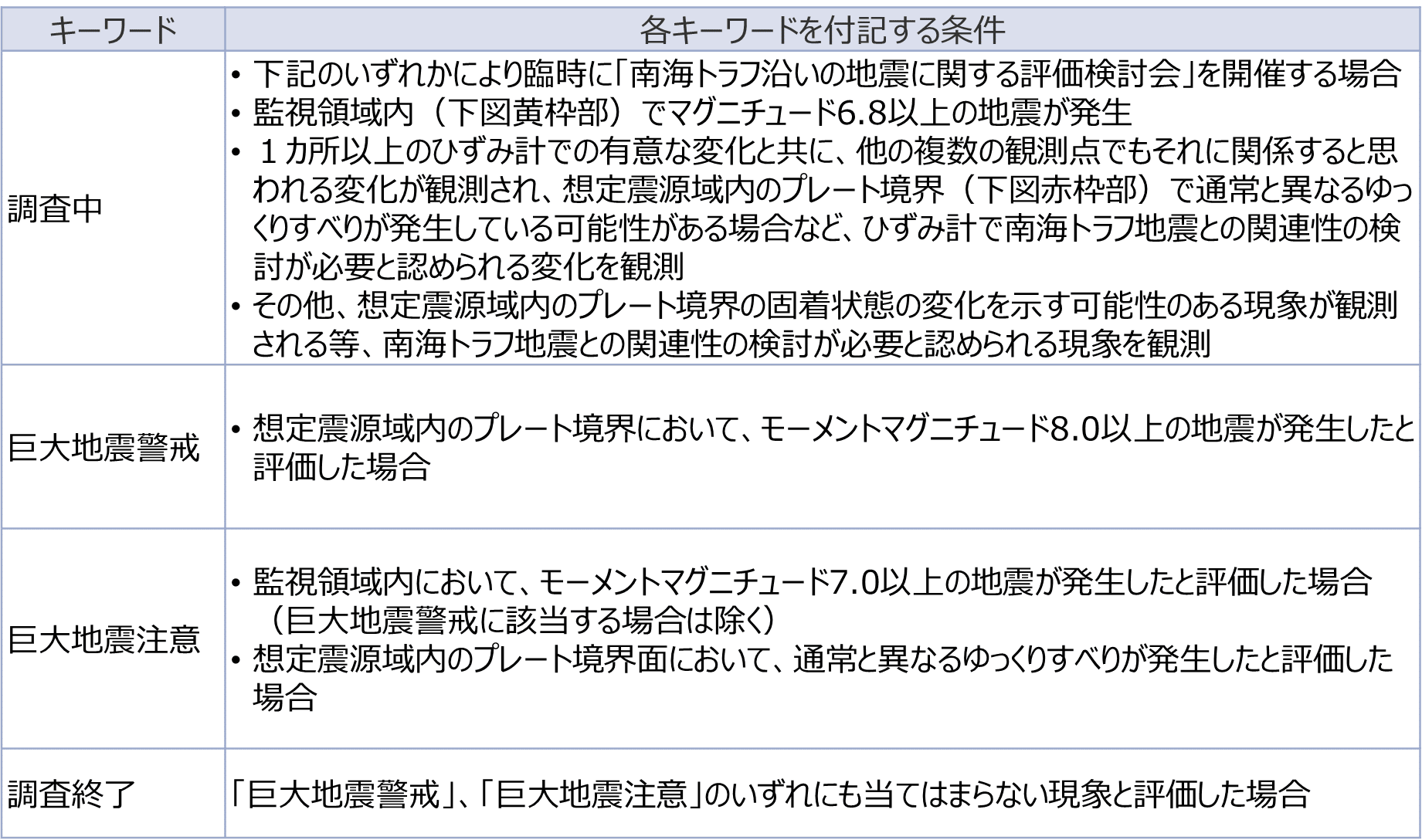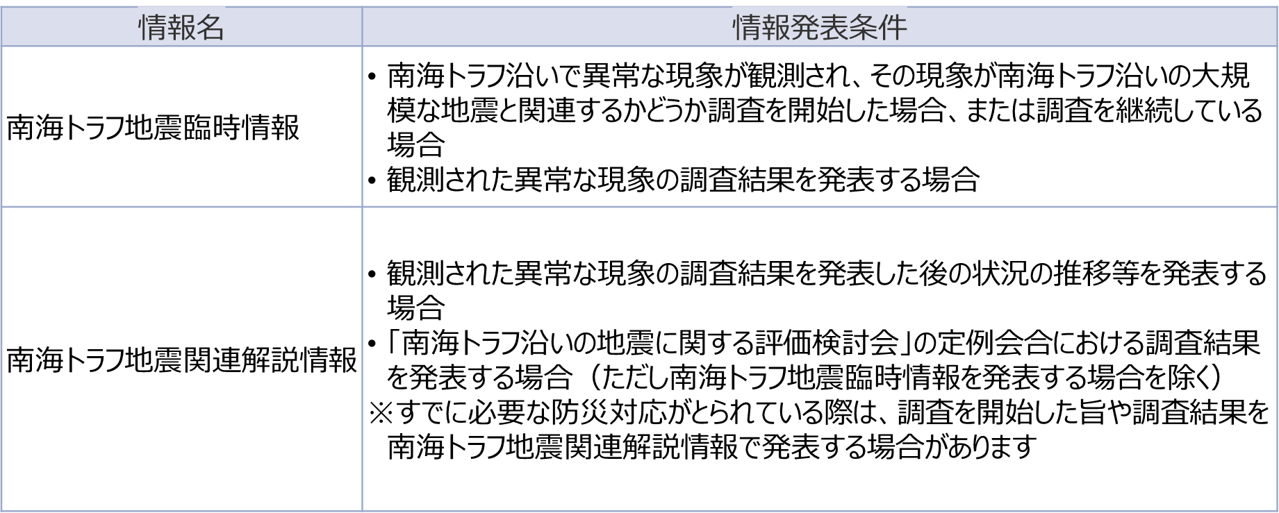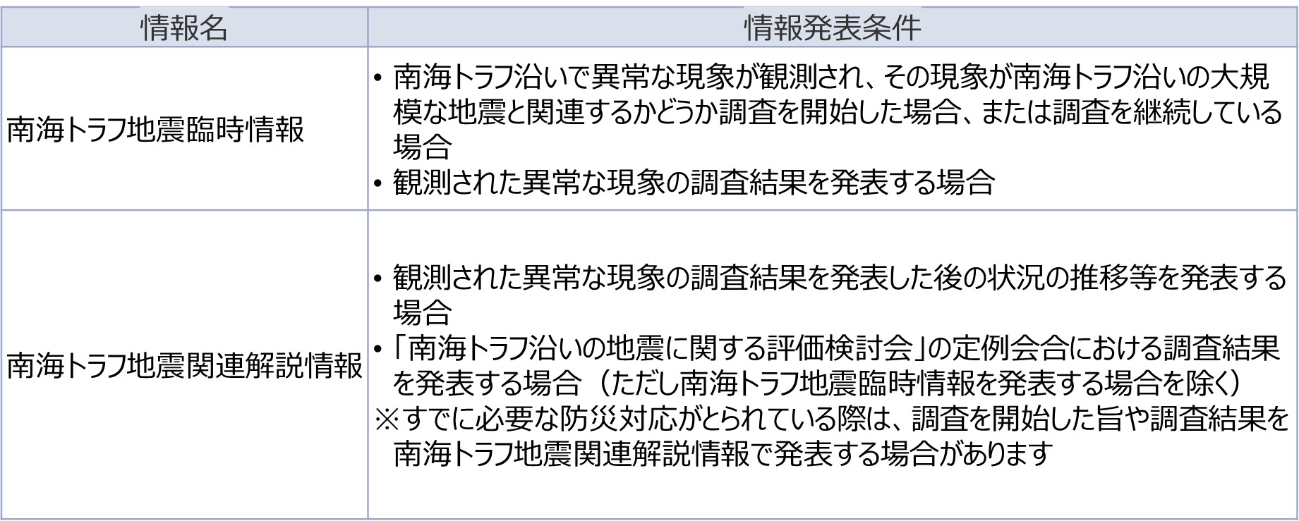 「南海トラフ地震臨時情報」と「南海トラフ地震関連解説情報」の2種類があり、次の条件に該当する場合に発表されることになっています。