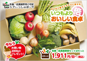 | 有機・低農薬野菜と無添加食品の会員制宅配サービスのらでぃっしゅぼーや。 全セット(定期便)2週目以降はお休み・他商品の追加が可能です。 お届けする商品は食材から日用品まで約8,000アイテム! 独自の厳しい基準をクリアした安心でおいしいものばかりを取り揃え、週に1度玄関先までお届けしています。 らでぃっしゅ専用車エリアにお住まいの方は、野菜セットぱれっとは配送料無料でお届けいたします。(※らでぃっしゅ専用車エリアに限る) 選ばれる理由は、 ①旬のおいしい野菜、食材 ②厳しい基準の安全性、第三者機関による放射性物質検査 ③創業20年以上の宅配の老舗であること ④商品のバラエティーさ・品揃え!年間 約8,000品目! らでぃっしゅぼーやは、事業活動による環境負荷もできる限り抑えるよう、資材や資源のリサイクル・リユースに積極的に取り組んでいます。 健康も美しさも、そして地球環境も。 らでぃっしゅぼーやは、こだわりぬいた“食”をご提案しています! |