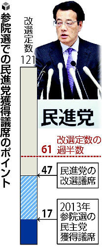 党内には、自民党を上回る獲得議席を「目標に据えるべきだ」とする「強硬論」もあるが、改選議席47(旧維新の党出身の無所属議員4人含む)の確保が「最低限のライン」(ベテラン議員)との見方が大勢だ。