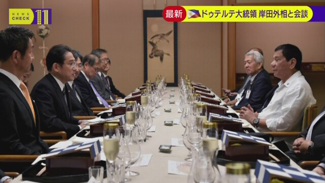 ドゥテルテ氏は25日夜、東京都内の日本料理店で岸田文雄外相主催の夕食会に出席。この後、岸田氏は記者団に「中国訪問の率直な印象を聞かせてもらった。さまざまな地域情勢に話題は及んだ」と説明。ドゥテルテ氏から日本国民に向け「フィリピン国民は心から日本の支援に感謝している。自分の世代が十分にお返しできるか分からないが、次の世代では必ず返したい」とのメッセージを託されたことも紹介した。