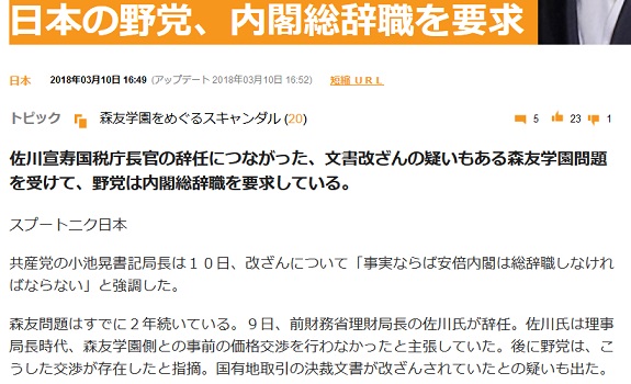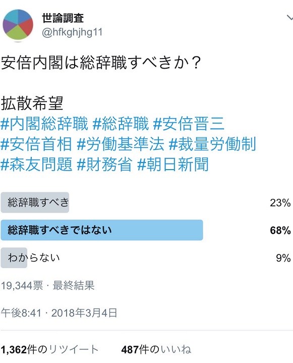 世論調査:野党、安倍内閣総辞職すべきだ!、世論調査で総辞職すべきでない68%。 https://twitter.com/hfkghjhg11/status/972435247605325824 ※関連スレ 【速報】野党、内閣総辞職を要求!! これ解散総選挙もあるなw http://hayabusa3.2ch.sc/test/read.cgi/news/1520683038/