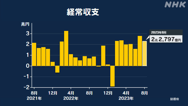 財務省が10日発表した国際収支速報によると、日本が貿易や投資でどれだけ稼いだかを示す8月の経常収支は2兆2797億円の黒字だった。黒字幅は前の年の同じ月に比べ1兆6050億円増えた。