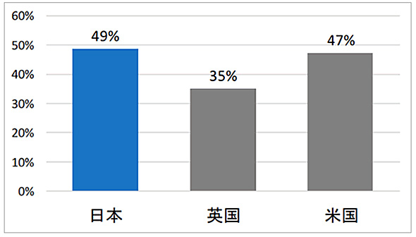 人工知能やロボットなどによる代替可能性が高い労働人口の割合寺田: 「日本のホワイトカラーは生産性が低い」といった言葉を耳にしたことがあるかと思うのですが、本来であればコンピュータなどで代替できていてもおかしくないような職業でも、まだ残っている。一方の英国は職場にシステムの導入が進んでいるので、分析結果として割合が低くなりました。