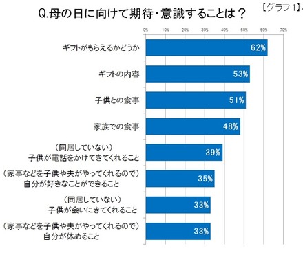 具体的に期待・意識していることについても質問したところ(複数回答可)、最も多かったのは「ギフトがもらえるかどうか(62%)」、次いで「ギフトの内容(53%)」と、「母の日ギフト」に関連した回答が集中した。そのほかにも「子供との食事(51%)」や、「家族での食事(48%)」といったことに期待していることがわかった。