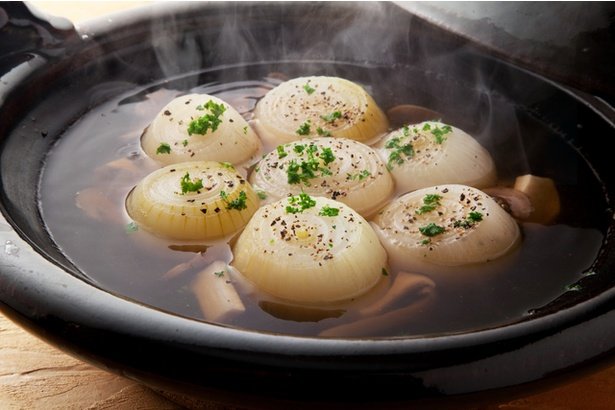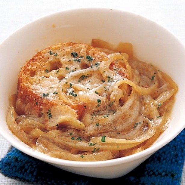 1.玉ねぎは縦半分に切って横薄切りにする。鍋にバターを溶かして玉ねぎを入れ、弱めの中火でよく炒める。ほんのり茶色になるまで炒めたら水、固形スープの素、ローリエを加え、煮立ったら弱火にし、約8分煮る。塩、こしょうで味をととのえる。