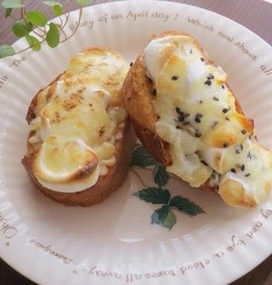 カリッと焼けたフランスパンの上に、チーズとマシュマロがとろ~りとろけてたまりません♪黒ごまとの相性もばっちりですよ!