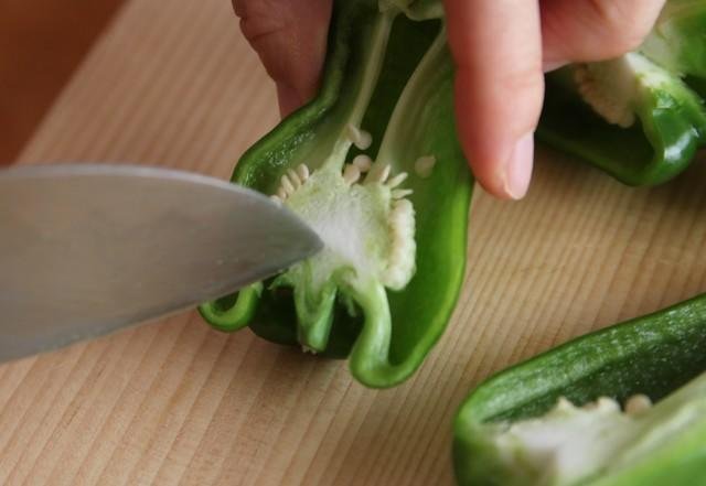 肉詰めを作る際、ピーマンから肉が離れないようにする方法として、なんと種を残したまま詰めるというやり方がある。