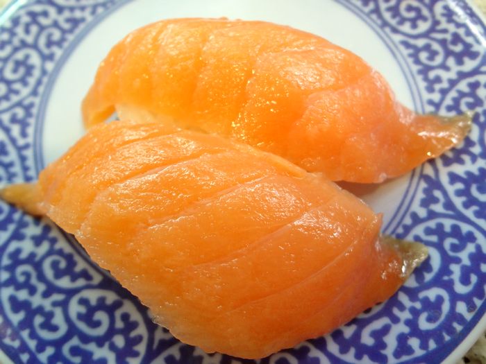 ここまで表面のヌメリが強いサーモンは100円寿司でも珍しいと思います。