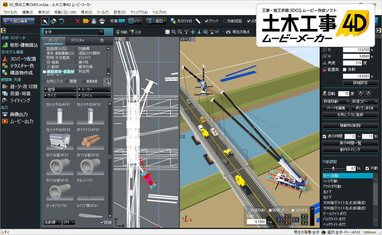 本ソフトは、点群やCADデータを読み込み、自由に道路を作成することで、現場を3DCGで素早く再現、各部品に動きと動作時間を設定することで動画を作成できます。