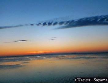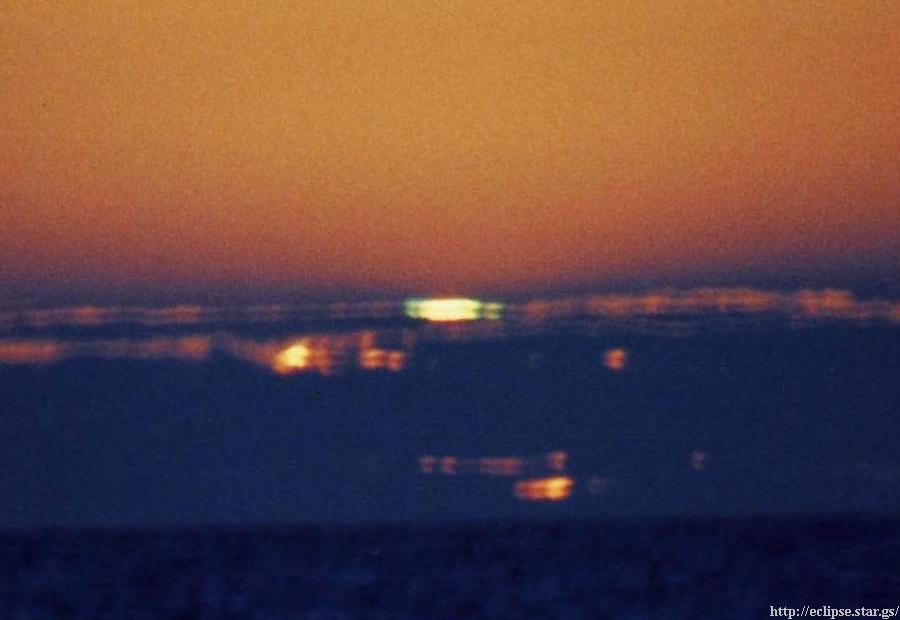 先に金星が地平線の雲に隠されて、これから8年後まで金星の太陽面通過はお目にかかれなくなった。もうすぐ日没…と思った瞬間、自然からの素晴らしいプレゼントをいただいた。太陽の上縁が大きく歪んで伸びたかと思うと。一瞬緑色に光った。見間違いでなければ、これが人生初のグリーンフラッシュだ。2002年12月4日のオーストラリア皆既日食も皆既終了後、部分日食のまま太陽は地平線に沈んだのだが、砂漠の砂が乱反射したのかグリーンフラッシュはお目にかかれなかった。まさか稚内で見られるとは!!日食掲示板の仲間達も雄叫びをあげて大興奮していた。