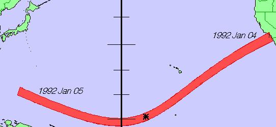 日本でも近海を通過する金環日食に伴う部分日食が、1992年1月5日に見られます。今回の観測は日付変更線を超えたL.A沖で日没金環日食を1992年1月4日に観測して、アラスカでオーロラを見ます。日没金環だけを観測するのがA・Bコース。Cコースは、年末年始をアラスカで過ごすので料金も割高です>_<