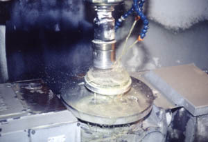 それから別棟に移り、最も見たかったレンズの研磨工程を紹介されました。まず厚いガラスをレンズに削る工程、やがて機械油の匂いが充満してきます。機械の内部を覗くと、レンズが水と研磨剤を一緒にかけられながら小気味良く高速回転していました。片面ずつ研磨するそうです。多分主鏡の研磨工程だと思います。隣の部屋には研磨されたレンズが数多く並べられていました。