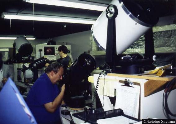 離陸した飛行機は、日付変更線を越えて3日の朝L.Aに到着。約10時間のフライトです。到着後レストランで昼食を取り、早速バスでMeade社の工場へ。青いシャツを着た社長が我々を迎えてくれました。最初は吹き抜けのある広い土間に置かれた屈折式望遠鏡と反射式望遠鏡の商品説明から始まります。その場で実際に望遠鏡を動かしてくれました。手元のパネルを動かして操作します。