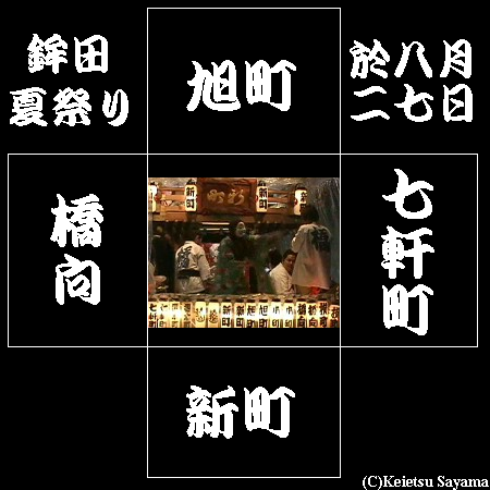 鉾田の夏祭り・新町新町の御囃子今年の8月27日に、茨城県鉾田市の中心部で行われた鉾田の夏祭りです。新町の御囃子を紹介します。身体が動きたくなるようなお祭りです♪山車配置の見取り図茨城銀行鉾田支店前の交差点で鉾田の夏祭りが行われました。既に山車は所定の位置に配置されていて、祭りが始まっていました。一番最初は新町です。夏祭りの会場も新町で、いわば地元中の地元です。