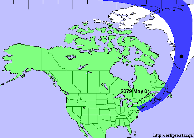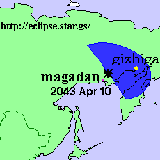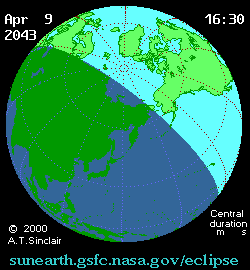 2043年4月10日の皆既日食は、最大蝕付近〔北緯61度18分7秒 東経151度58分2秒〕で1分50秒の皆既日食。太陽高度は0.390%)としてオホーツク海北東部で観測出来ます。これは世界時の表記と一日ずれますが、最大接触地点は4月10日の日の出と同時に皆既日食が始まるので現地時間の表記とします。