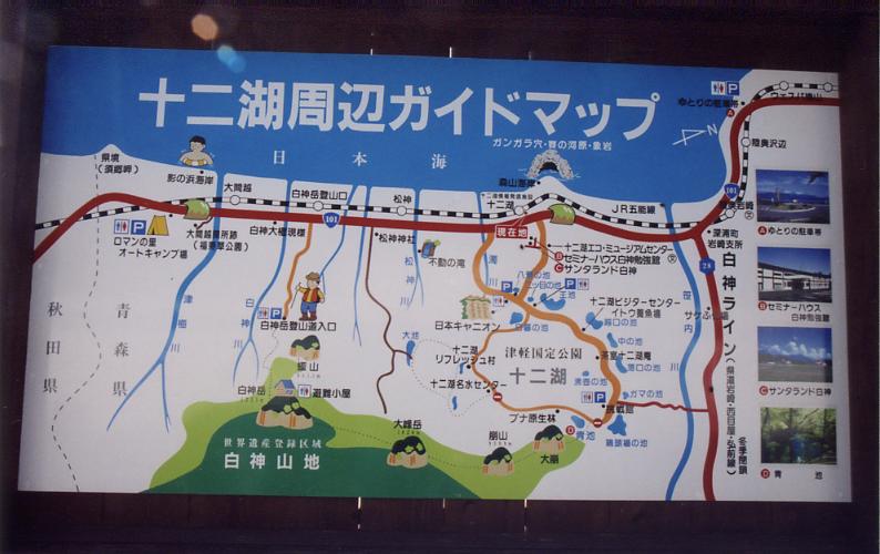 十二湖駅前より弘南バスの路線バス(冬季除く)又はサンタランド白神行きのシャトルバスがあります。そのサンタランド白神は、旧岩崎村がサンタクロースのふるさとフィンランド国ラヌア郡と姉妹都市の締結をしたのを機に計画・建設されました。