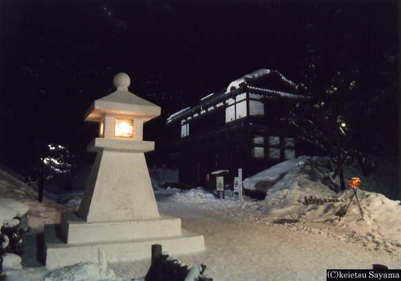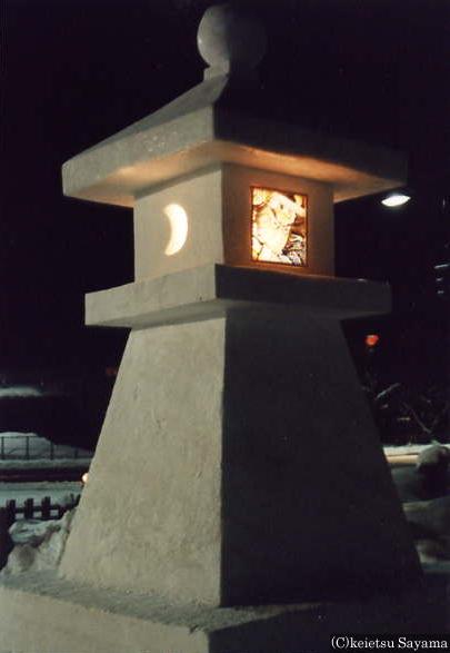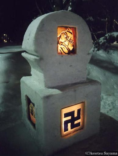 雪燈籠・東門周辺弘前公園見取り図雪燈籠と東門東門の雪燈籠東門奥の雪燈籠以前は燈籠の下部は雪だけでしたが、弘前市主催の意味も込めて雪燈籠の下部に弘前市の市章である卍を入れることになったそうです。卍の横に牡丹の花が描かれていますが、これも旧津軽藩の家紋である牡丹が使われています。この牡丹は、ねぷたの開き(ねぷた絵の下側を覆うもの)にも描かれているものです。東門や追手門など公道に面している門に立てられている雪燈籠は、主に市役所の職員が作成しています。非常に丁寧に作られていて美しい雪燈籠です。