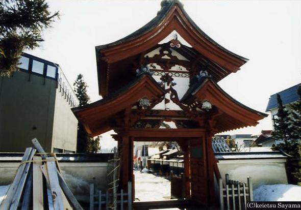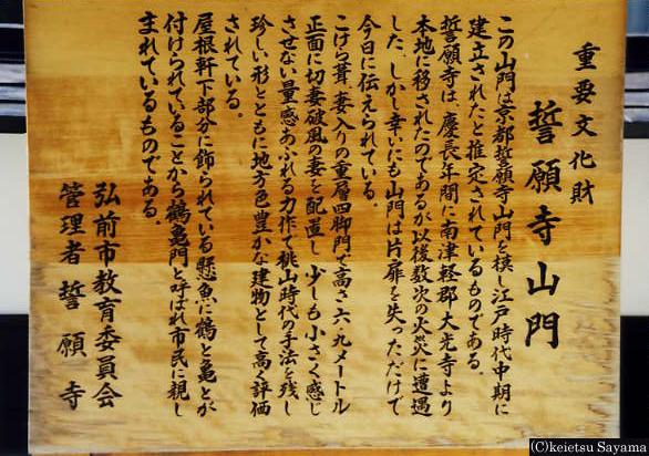 弘前の和風建築・誓願寺誓願寺山門慶長元年(1596)平賀町大光寺に建立、弘前城築城の際に現住所に移されました。京都誓願寺を模して建てたとも伝えられ、山門は重層、切妻造り、妻入り、こけら葺きの四脚門。屋根の軒下には鶴と亀がつけられていることから鶴亀門と呼ばれています。※駐車場/4台 ※入場料/50円 ※見学時間/館内9:00~16:00/外観撮影自由・無休 ※住所 弘前市新町247 Tel 0172-34-5532誓願寺説明看板誓願寺山門・表誓願寺山門・裏誓願寺・本殿弘前ねぷたの袖絵(左側)に描かれた誓願寺山門(平成二年制作)