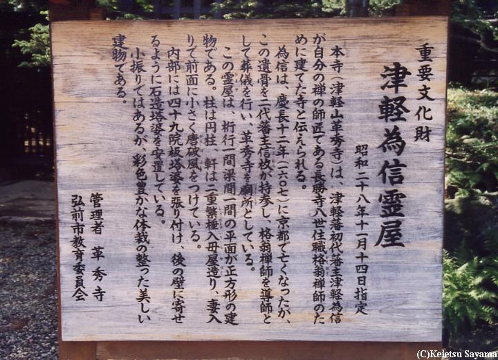 津軽為信・霊屋革秀寺のすぐ近くにある津軽為信・霊屋は桃山風の霊廟建築です。建立当初は境内全域を聖域化し、武士の立ち入りまで厳しく制限した建物です。津軽為信・霊屋※駐車場/なし※開館時間/AM9:00~PM5:00・4月25日~11月3日まで開館(無休)※住所 〒036-8273 弘前市藤代1-4-1 Tel 0172-32-7460※外観撮影見学可能・入館料150yen 平成5年8月17日に国の重要文化財へ指定されました霊屋由来霊屋正面霊屋裏手 津軽為信・霊屋の周囲は土手に囲まれていて、土手の上に登れば容易に写真が撮られます。
