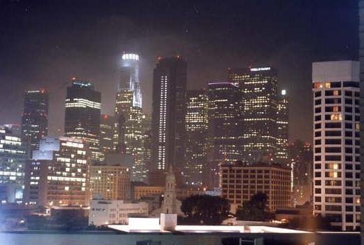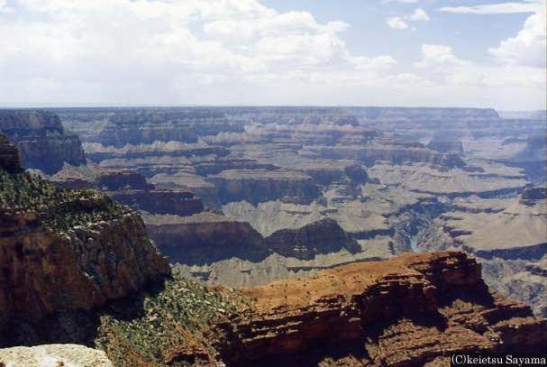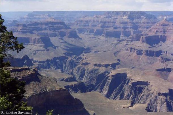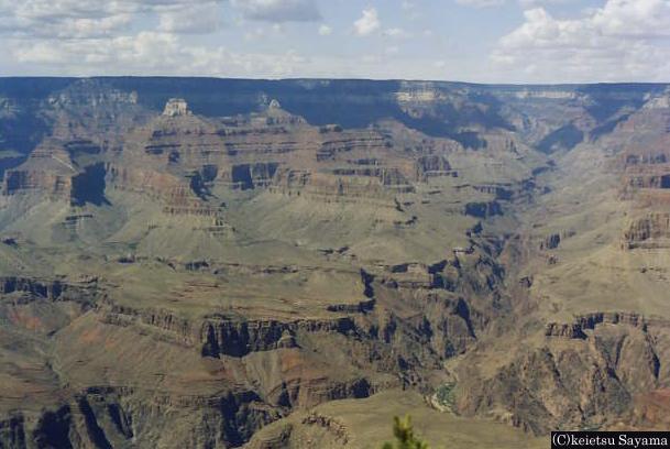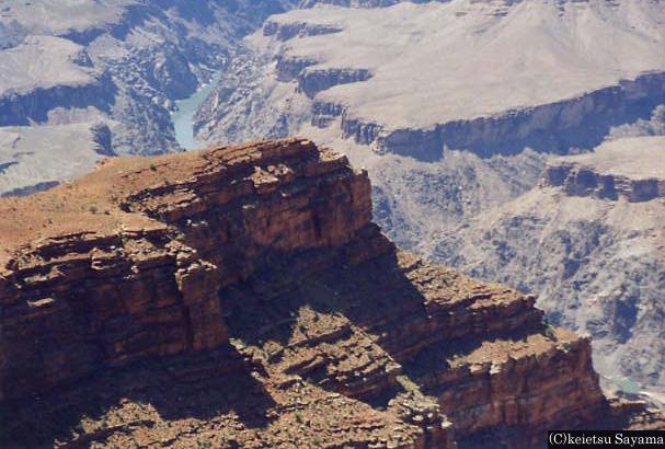 グランド・キャニオン3グランドキャニオングランドキャニオン・左上はコロラド川崖から見える地層は全て先カンブリア紀のもの自然の偉大さを感じます昔ここは海底でしたが、ロッキー山脈造山運動のため陸になったそうです。造山運動の前は先カンブリア紀の陸地が広がっていたようで、崖から見える地層は全て先カンブリア紀の物です。普通の崖は底に谷が見えるだけですが、ここは崖が崩落してより雄大な風景にさせています。隣の土産物屋に入るとハガキや写真が置いてあり、ここも雪に覆われる事を知りました。再びL.Aに戻りホテルヘ向かいます。夕暮れの繁華街の中、ふと空を見上げると月齢2の細い月が見えていました。Los Angelsの夜景