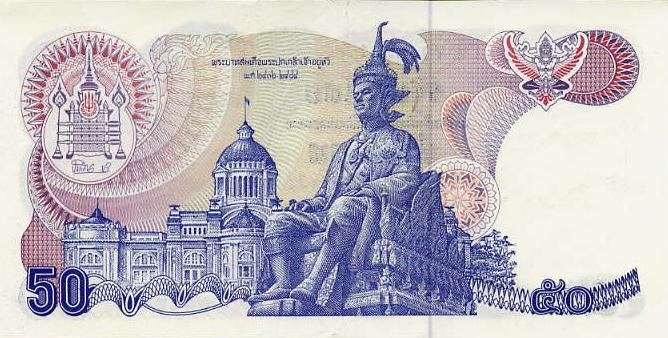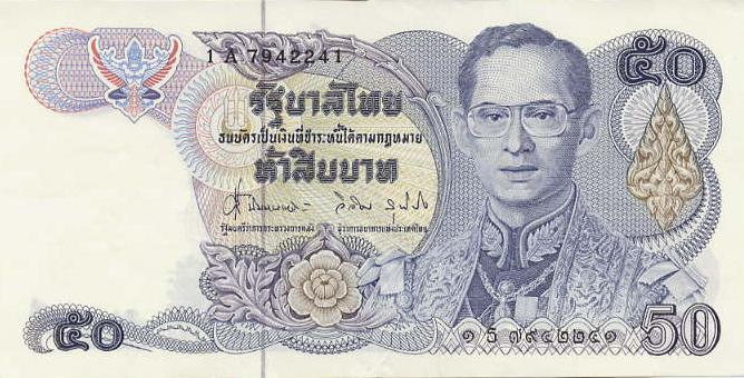 タイの通貨には必ずプミポン国王が肖像として使われています。1バーツ=3.64円なので、50バーツなら182円の価値と言うことです。この紙幣だけ青っぽく良かったので紹介しました。