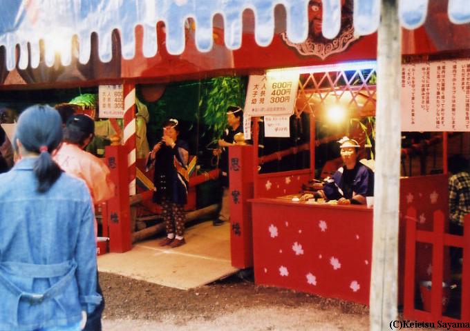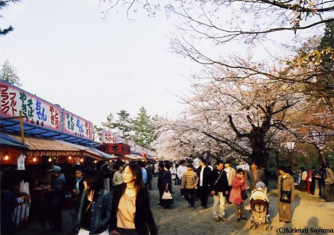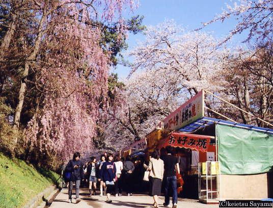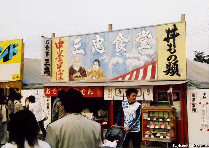 弘前さくらまつり・露天商2004年4月24日に撮影したさくらを紹介します。場所は青森県弘前市下白銀町の弘前公園です。弘前公園見取り図東門奥の桜この付近でレトロなスマートボールが営業中お化け屋敷思案橋昔ながらの看板・三忠食堂この三忠食堂は、親が子供の世代から掲げられている看板で大正ロマンを感じさせます。値段は結構高いのですが、椅子とテーブルが置いてあってしっかりとした作りになっています。店の奥で食べると砂利の埃が入ってこないので快適です♪この看板は市内の『光洋社』さんという看板屋さんが描いてくれたもので、モデルは看板屋さん自身と自分のお孫さんだそうです。また店の主人が三代続いて忠の付く名前であったため、三忠と言う名前が付けられたのだそうです。まさに“花よりだんご”の代表格ですね♪